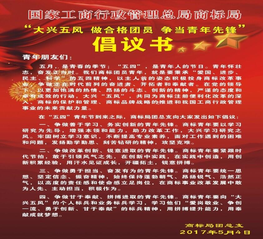 为引导团员青年坚定理想信念,传承“五四”精神,商标局团总支于5月4日举行了“五四”主题团日活动。全体共青团员和部分青年干部代表参加了活动。商标局党委青年委员吴勤同志出席活动。