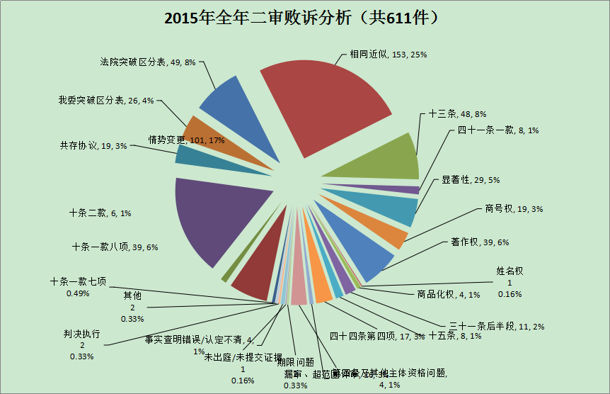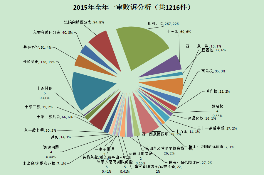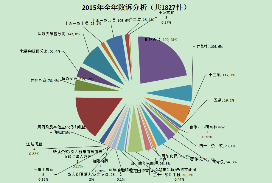 2015年,商评委一审、二审败诉案件数量为1827件,其中一审败诉1216件,二审败诉611件。通过对败诉案件进行分析,我们认为,导致败诉的原因主要可归纳为以下五个方面。