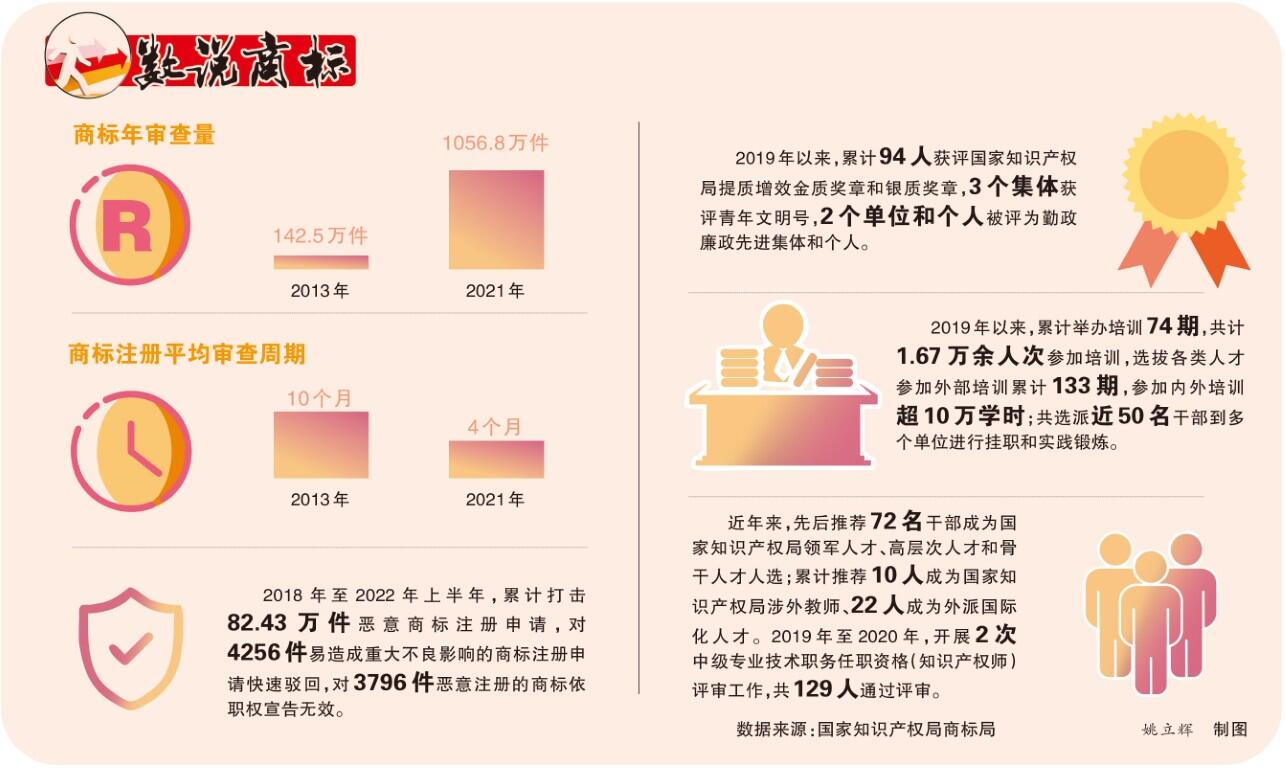 据统计,我国商标年审查量从2013年的142.5万件增长至2021年的1056.8万件;商标注册平均审查周期由10个月大幅缩短至4个月,一般情形商标注册周期缩短至7个月,实现知识产权领域“放管服”改革目标。2018年至2022年上半年,累计打击82.43万件恶意商标注册申请,对4256件易造成重大不良影响的商标注册申请快速驳回,对3796件恶意注册的商标依职权宣告无效,对恶意注册保持“零容忍”的态度,体现了商标局在营造良好营商环境方面的责任担当。