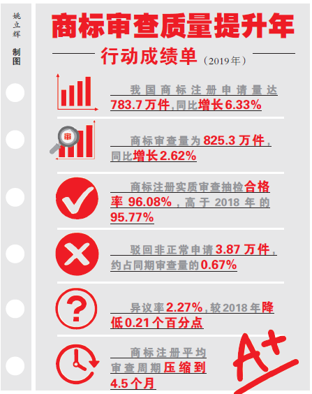 在日前举办的国家知识产权局商标局(下称商标局)2020年商标审查工作会议上,公布的一组数据颇为引人注目:2019年我国商标审查量为825.3万件,同比增长2.62%;商标注册实质审查抽检合格率96.08%,高于2018年的95.77%;商标注册平均审查周期压缩到4.5个月,商标审查效率、质量稳步提升。