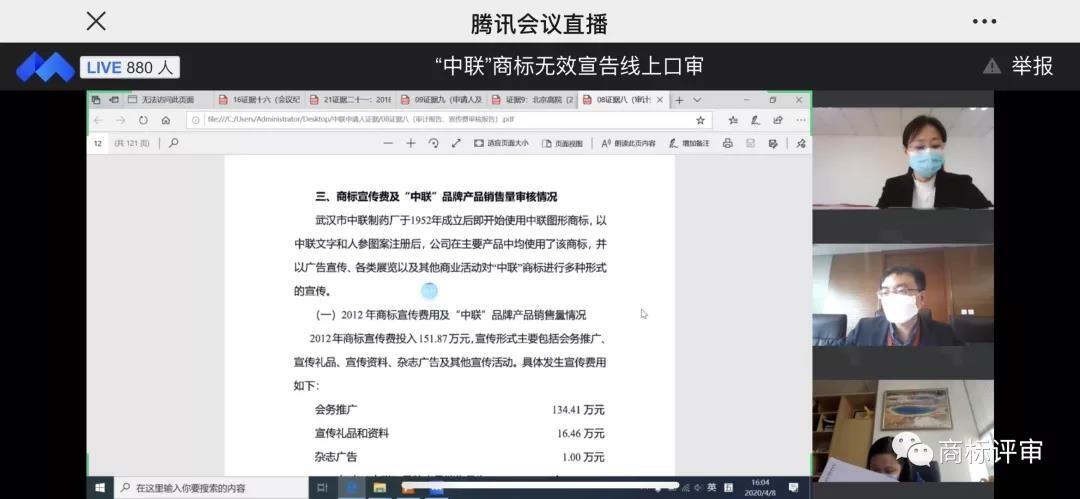 2020年4月8日下午,商标评审庭线上直播再次开庭,就三起“中联”系列商标无效宣告案展开并案口审。近2500人在线观看了庭审直播。