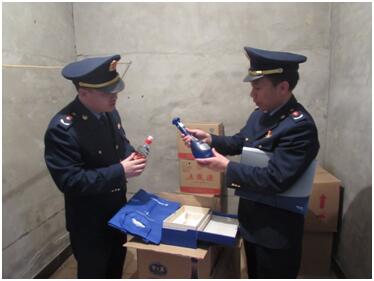 房山工商分局执法人员在检查查获的侵权白酒。 曹 振/摄